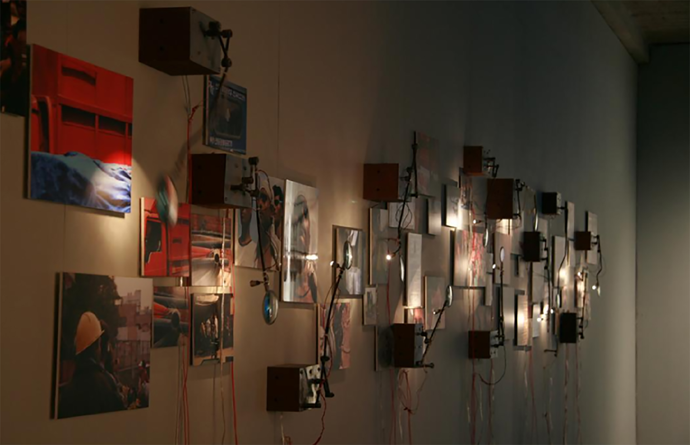 In 2006, almost every day I used to start with my camera from my residence to another corner of the city to capture images to map the city with photos. I had captured almost a thousand shots, mainly portraits of people (working class), fragmented cityscape, and textures of wall, skin, everything; and from these images I finally picked up around 70 images; put them on the wall quite rapidly. This created clusters of sorts, with different sizes of photographs. I then installed a set of moving lenses attached with contraptions in a way so that portions of photographs could be seen through them in an enlarged form.